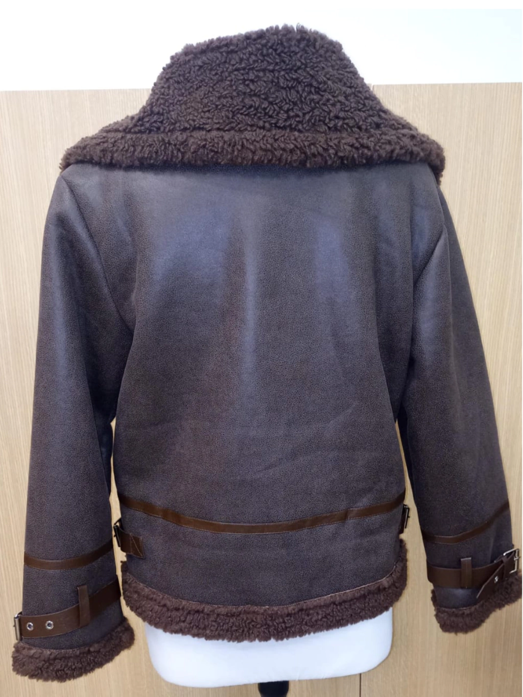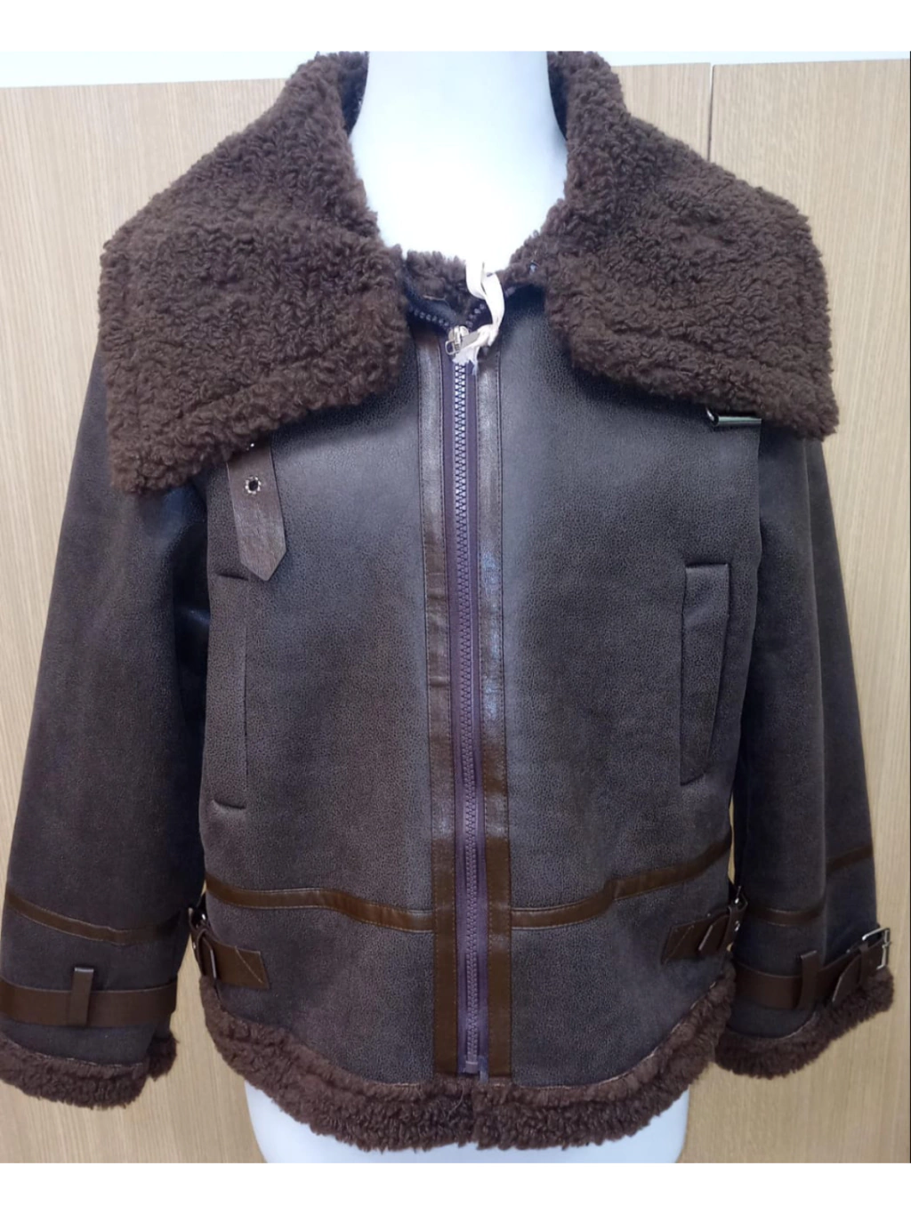 Campera de cuero ecologico con piel de cordero en el cuello y bolsillos laterales. Unico color disponible.