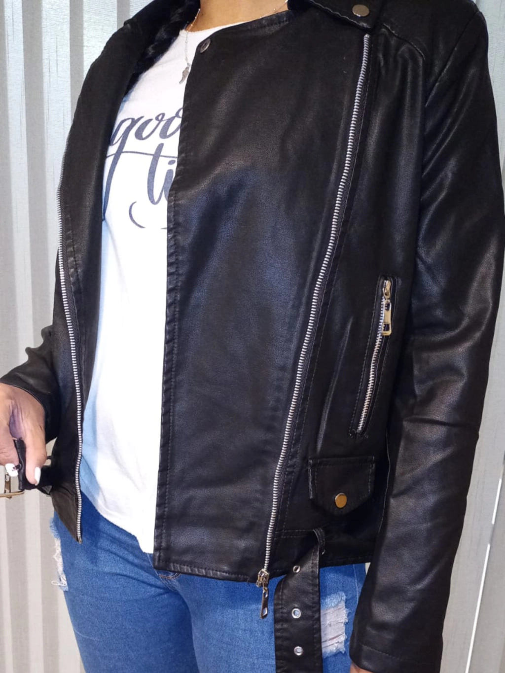 Campera de cuero ecologico con detalle de cierre, bolsillos y solapas. Unico color disponible.