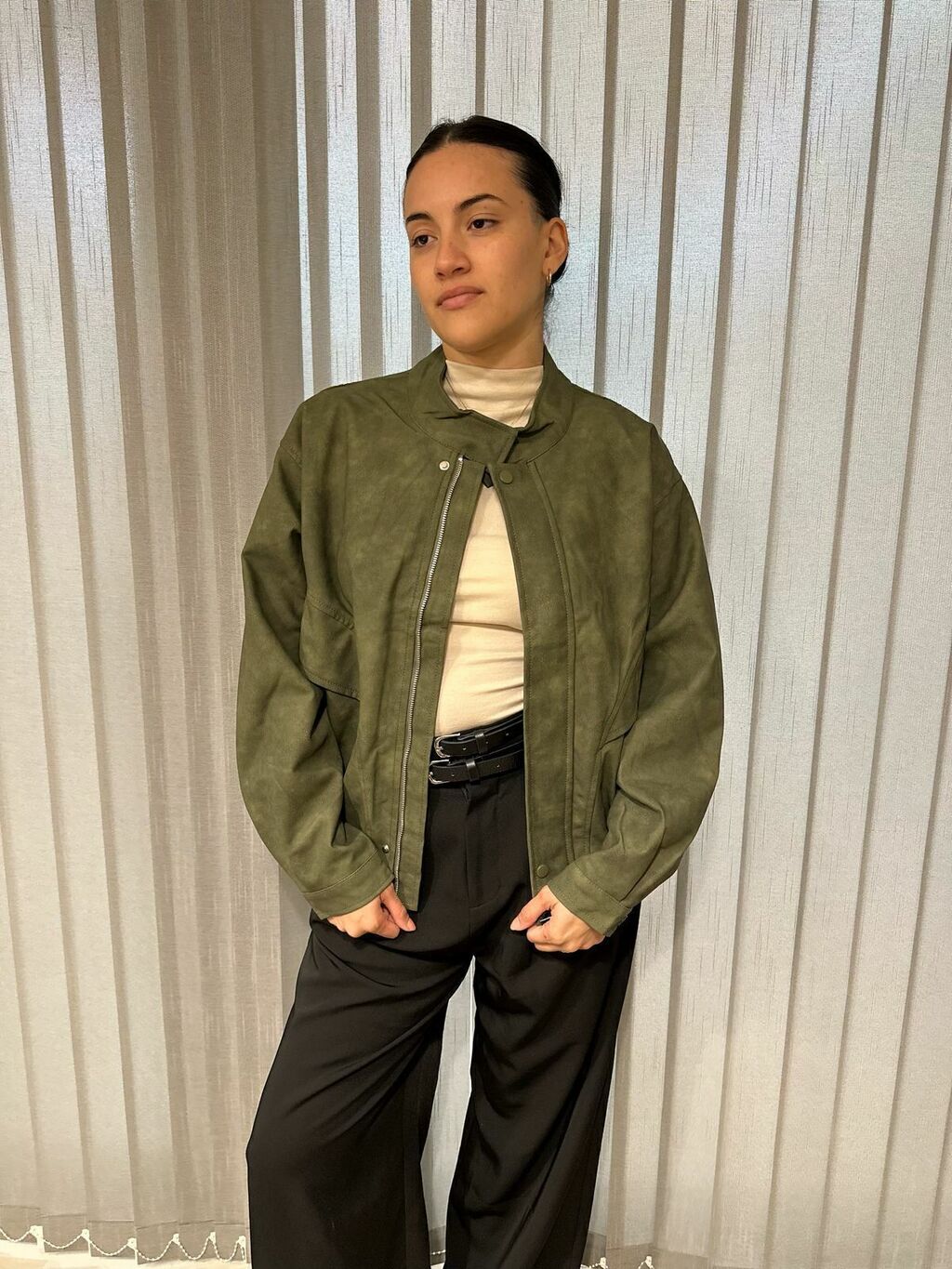 Campera de cuero ecologico con bolsillos invisibles y elastico en cintura, detalle de costura en las mangas. Unico color disponible.