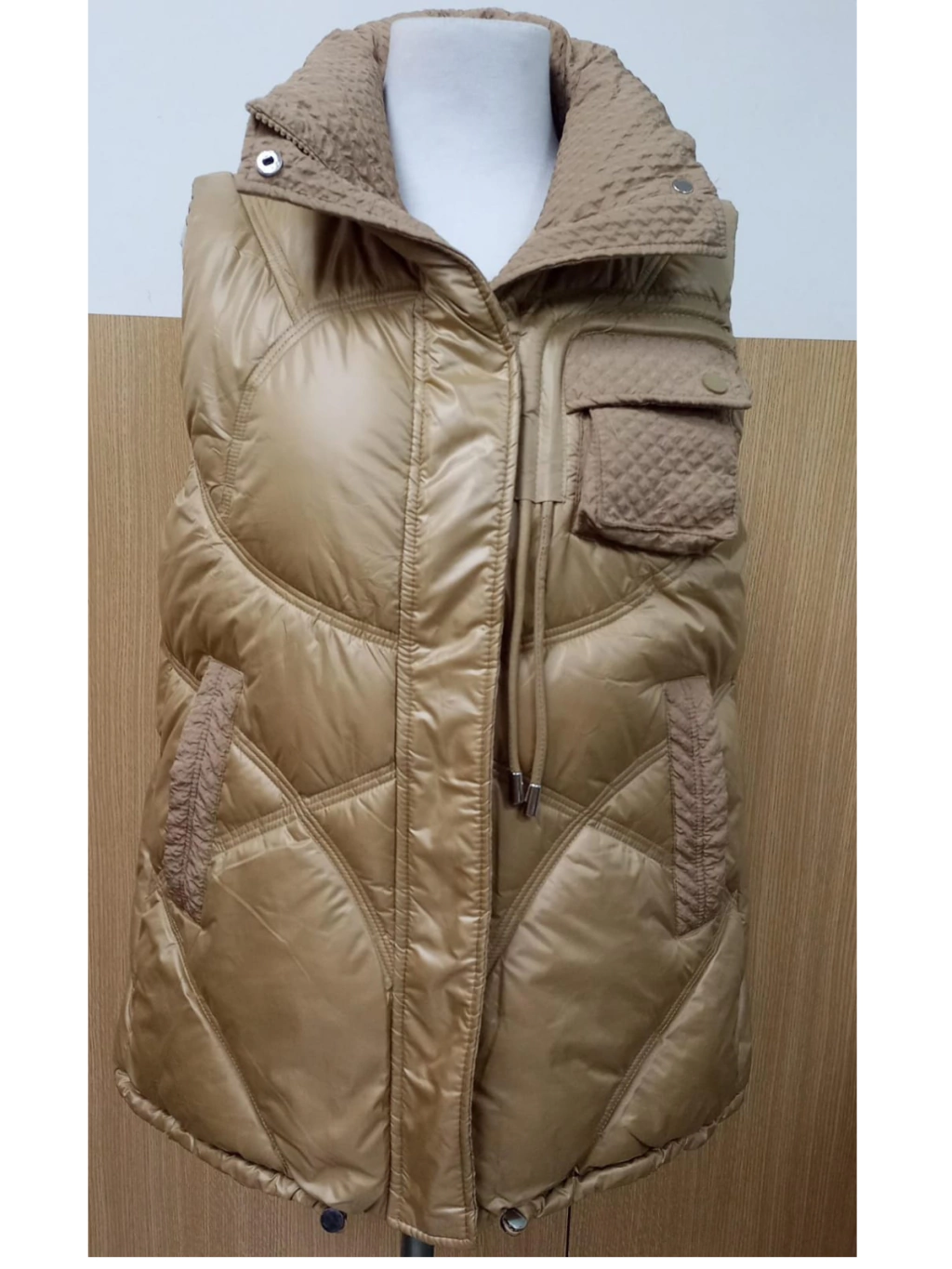 Chaleco puffer con cuello alto y detalle de bolsillo en el pecho. Cuatro colores disponibles.